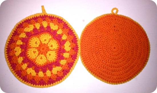 Garnet er ren bomuld, og jeg brugte vist en 4,5 mm nål. Der skulle 2 ngl til af det orange, og et af hver af de andre farver. Du kan også bruge ren uld. Akryl er jo en plastfiber, og selvom der nok skal en del mere varme til før de smelter end du kommer til at holde på med dem, så er jeg ikke sikker på at det er bedste valg. Jeg foretrækker bomuld til grydelapper, også fordi det er nemt at vaske på 60 grader, hvis der kommer mad på :-)