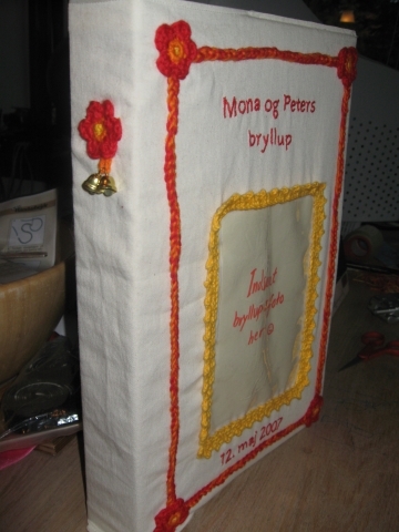 De to albums her er beregnet til at blive fyldt med billeder fra den store dag. Lommen på forsiden er til at indsætte bryllupsfotoet. Der er jo nærmest ingen grænser for, hvad man kan finde på af fantasifulde dekorationer af sådan et album - det kan strikkes, hækles eller sys, og pyntes med hvad som helst. Teksten kan laves med broderi, mønster i strik, tekstilmaling eller -tuscher, pailletter, knapper eller hvad ved jeg. Selve albummet er på det første et helt almindeligt ringbind, som er fyldt med plastlommer til billeder. Man kan også bruge et lidt dyrere album med billedlommer, hvilket jeg gjorde på nr. 2.
