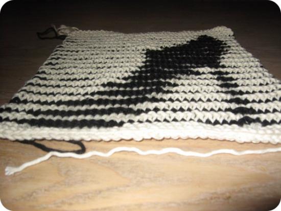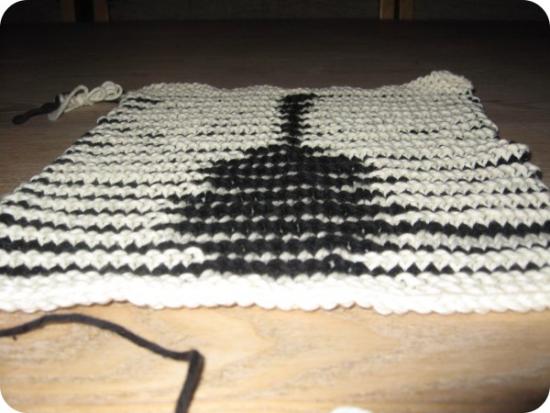 Her er endnu en lille gaveidé op til jul, og man skulle jo tro jeg var besat af grydelapper, men here goes :-) Disse grydelapper er nu heller ikke helt almindelige, for de er lavet i skyggestrik. De er lavet for år tilbage, som julegave til min bror og svigerinde. På den ene danner mønstret en guitar (bas), på den anden en højhælet sko :-)