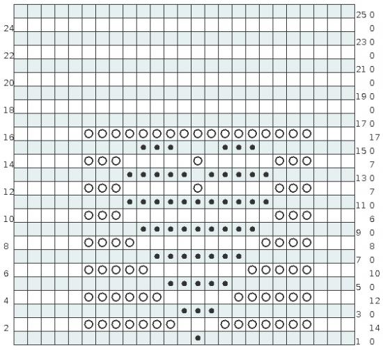 Fordi strikkede masker er bredere end de er høje, kan du fint lave et diagram, der kun tager højde for vrangpindene, synes jeg selv, og til det kan du blot bruge almindeligt ternet papir. Normalt skal man til diagrammer i strik bruge særlige programmer, der laver et ark med tern ud fra din strikkefasthed, fordi strikmasker jo som oftest er noget bredere end de er høje. Men til et lille projekt som dette synes jeg det andet er helt fint :-) Hvis du hellere vil gøre det 'rigtigt', kan du finde hjælp her.