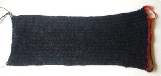 Herefter følger du det etablerede ribmønster til arbejdet måler 40-45 cm i højden til børn, 50-55 til voksne. Prøv om længden passer ved at lægge det rundt om halsen og holde enderne sammen. Afslut med vrangsiden og lad maskerne sidde på pinden. Bryd garnet med 1½ m garnende.