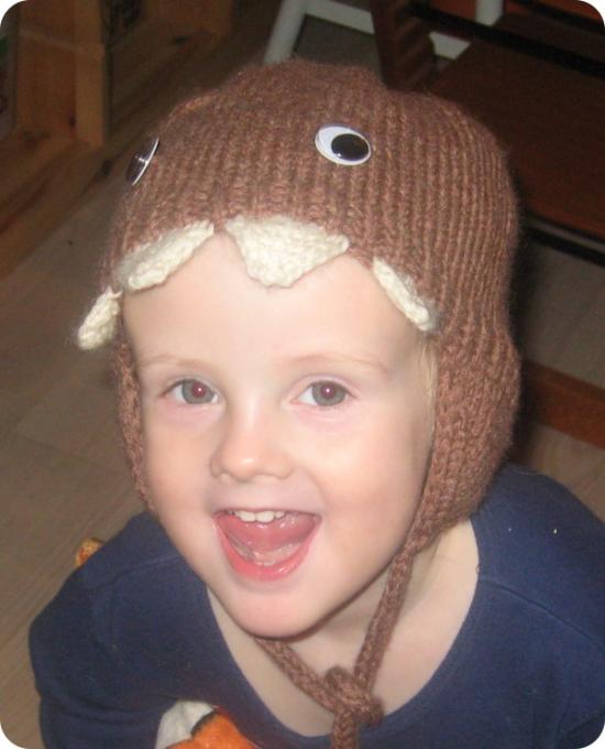 | Nåårh, lille mus :-) Monsterhuen lavede jeg til begge drenge for længe siden, og de er nu vokset fra dem, så de er på vej til næste lille dreng :-) Det er virkelig et skønt mønster, og du finder det gratis her. Jeg lavede dem i en Peruvian Highland agtig uldgarn, på p 4½, tror jeg. Til øjnene kan du evt. bruge dem, jeg har mønstre til her, eller gøre som Irene gjorde med at sy dem på med maskesting. | ||