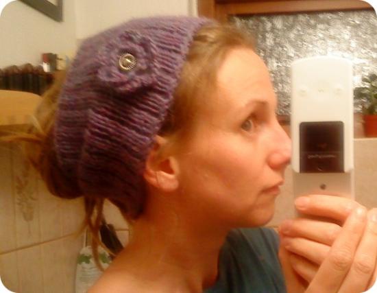 | Dette hårbånd kan fint bruges som pandebånd, hvis det laves i uld så det bliver godt tæt - også selvom der er lidt hulmønster ved kanten. Mit første forsøg ud i snoninger for år tilbage :-) Se det gratis mønster her. | ||