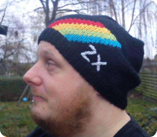 | Alle gode gange 3 - denne har heller ikke et mønster endnu *flov* Den fine hue, jeg lavede på bestilling til min søde mand. Det er en ægte geek-hue - regnbuen og bogstaverne er logoet for den første computer, han havde dengang i 80'erne, ZX Spektrum. Jeg laver et mønster på den MEGET snart, for jeg har alle noterne klar :-D | ||
