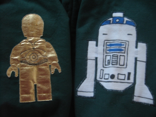 Storebrors jakke blev pyntet med applikationer på ærmerne og en lille tut på hætten. Da han er kæmpe LEGO fan, blev det en C3PO og R2D2, a la LEGO Star Wars :-D Knapperne har han selv valgt hos Stof 2000.