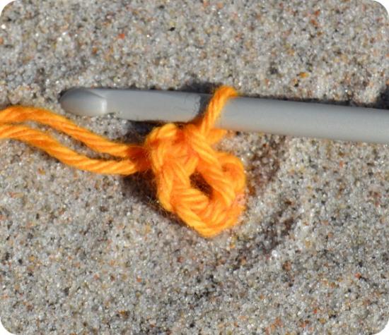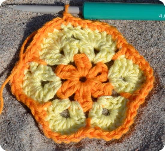 | Omg. 4: (Skift farve.) I lm-mellemrum *7 stgm* 6 gange (første stgm laves som 3-lm kæde). Afslut med km til 3. lm. | |