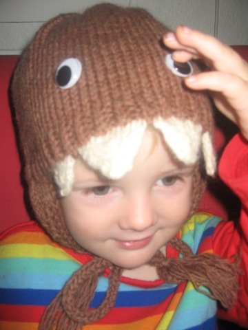 Jeg fandt denne opskrift på denne fine side via strikkesiden Ravelry, og elsker den bare! Storebror blev helt vild, og der er en undervejs til Lillebror, og måske også en til min mand, da han også blev begejstret :-D