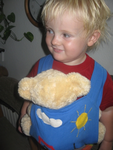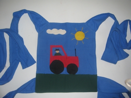 Den vakte stor fødselsdagslykke, den fine mei tai med traktor-applikation, da Lillebror for nylig fyldte 2. Den passede perfekt i størrelsen til den nye bamse med stof-hus fra mormor.