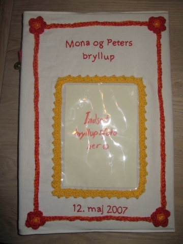 De to albums her er beregnet til at blive fyldt med billeder fra den store dag. Lommen på forsiden er til at indsætte bryllupsfotoet. Der er jo nærmest ingen grænser for, hvad man kan finde på af fantasifulde dekorationer af sådan et album - det kan strikkes, hækles eller sys, og pyntes med hvad som helst. Teksten kan laves med broderi, mønster i strik, tekstilmaling eller -tuscher, pailletter, knapper eller hvad ved jeg. Selve albummet er på det første et helt almindeligt ringbind, som er fyldt med plastlommer til billeder. Man kan også bruge et lidt dyrere album med billedlommer, hvilket jeg gjorde på nr. 2.