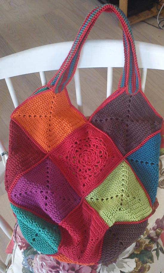 Jeg fandt opskriften til tasken her på ravelry.com og måtte jo bare lave den :-) Den er knap så farvelade-agtig i opskriften, men jeg er altså lidt farvelade-agtig, så det smitter af på kreationerne ;-) Til gengæld kan jeg ret godt lide det farveskiftende garn i opskriften, men jeg valgte altså solids til denne.