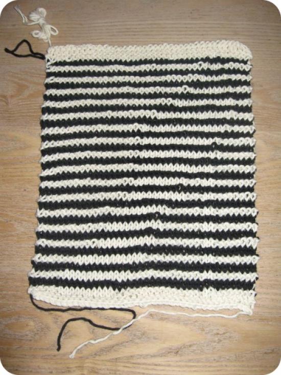 Man strikker altså 2 pinde med hver farve, og den pind du strikker på retsiden er bare alle ret. På vrangsiden er dér the action is - her strikker du vrang, når farven skal falde i baggrunden, og ret når masken skal træde frem.
