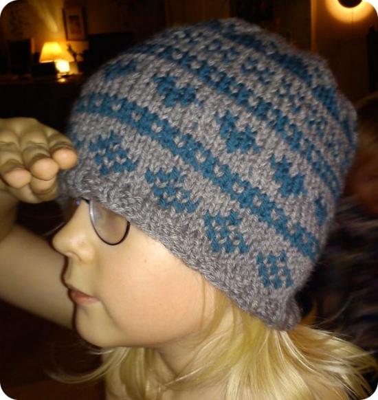 | Denne hue er så fin at jeg har lavet 2 :-) Denne til min mor, her modelleret (??) af min ældste søn, strikket i 2 tråde Lucca fino på p 6½. Mønstret køber du her. Jeg lavede også en til mig selv i rød, men den blev bare ikke så fed - jeg brugte en uld-bambus blanding, og den var for tung, så mønstret ligesom blev for fladt. | ||
