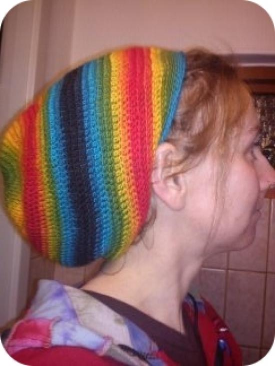 | Jeg har ikke fået lavet et mønster på denne hæklede hue i Zauberwolle, men den er uhyre simpel :-) Fra toppen og ned på en 3 mm nål i spiral. Den er ret høj, fordi den skal rumme dreads, men det kan man jo selv styre. Jeg lægger et mønster ud på den snart, men hvis du er lidt rutineret kan du sikkert regne det ud - og ellers må du rigtig gerne spørge :-) | ||