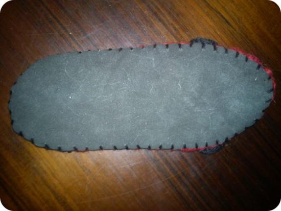 Så er du klar til at sy dem på. Det kan være en god ide at gøre det med stoppegarn, som er ret tyndt og med lidt polyester i for styrken. Læg så sålen på med den glatte side ind mod skoen, og fastgør evt. med nåle. Sy med kastesting, så kanterne bliver pæne. Hæft ender, og du er færdig :-)