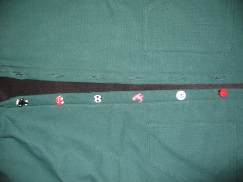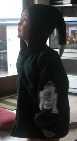 Storebrors jakke blev pyntet med applikationer på ærmerne og en lille tut på hætten. Da han er kæmpe LEGO fan, blev det en C3PO og R2D2, a la LEGO Star Wars :-D Knapperne har han selv valgt hos Stof 2000.