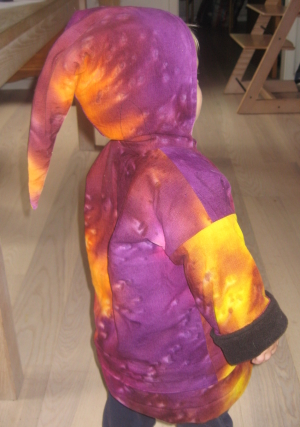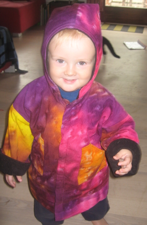 Lillebrors jakke er lavet efter mønster til str. 3 år og let modificeret mht længde (der er senere tilføjet et stykke i længden, fordi han er langlivet og den kom højt op over taljen, når han løftede armene :-/). Den er lavet i et stykke babyfløjl, jeg havde liggende, og foret med fleece der også bare lå og ventede på at komme i brug.