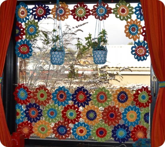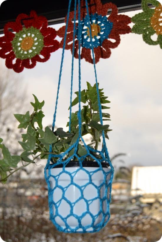 Jeg elsker at have planter i vindueskarme, men det er ikke altid nemt med katte, der synes de skal sidde der og skubbe alting ned. Enter: ophæng til potter. Dem kan man selvfølgelig godt købe, men man kan også lave dem rigtig nemt selv :-) Jeg plejer faktisk bare at binde dem af 10 lange tråde tykt bomuldsgarn, og så slå knuder på kryds og tværs (hm, kræver måske en lille billedserie i sig selv...), men denne gang syntes jeg de skulle hækles. Jeg brugte samme garn som til blomsterne, men kun 1 tråd og 6 mm nål.