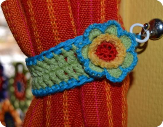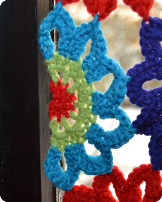 Jeg har arvet flere sæt 70'er gardiner fra min fasters loft (I ved, den gode slags faster der kun smider noget ud, når det virkelig er nødvendigt ;-)), og det rød-orangestribede her passede perfekt til vinduet i køkkenet. For at det ikke skal tage for meget lys, eller væg ved siden af, har jeg valgt at binde det op med bånd i siderne. De skulle selvfølgelig matche alt det andet og er derfor lavet i samme garn, 2 tråde og 6 mm nål. Ud over garn etc skal du bruge 8 små gardinringe.