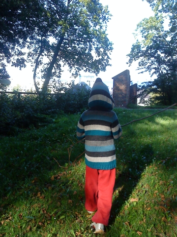 Update: Barnet vokser hele tiden! Særligt armene, synes jeg, han ender sgu med at slæbe dem hen ad jorden... Så derfor er jeg nu i gang med at forlænge ærmerne, idet jeg lige præcis havde 25 g tilbage af det petroleumsfarvede garn :-) Så jeg pillede ribben op og målte garnet (7 m) og kunne strikke 6 runder på dem. Der er 25 g garn = 50 m tilbage, og derfor til 33 runder. Det betyder at jeg kan lave 6 runder glat mere, og så 9 omgange rib + en aflukningsrunde. Så må vi jo se hvor længe det holder, før han igen er for lang ;-)